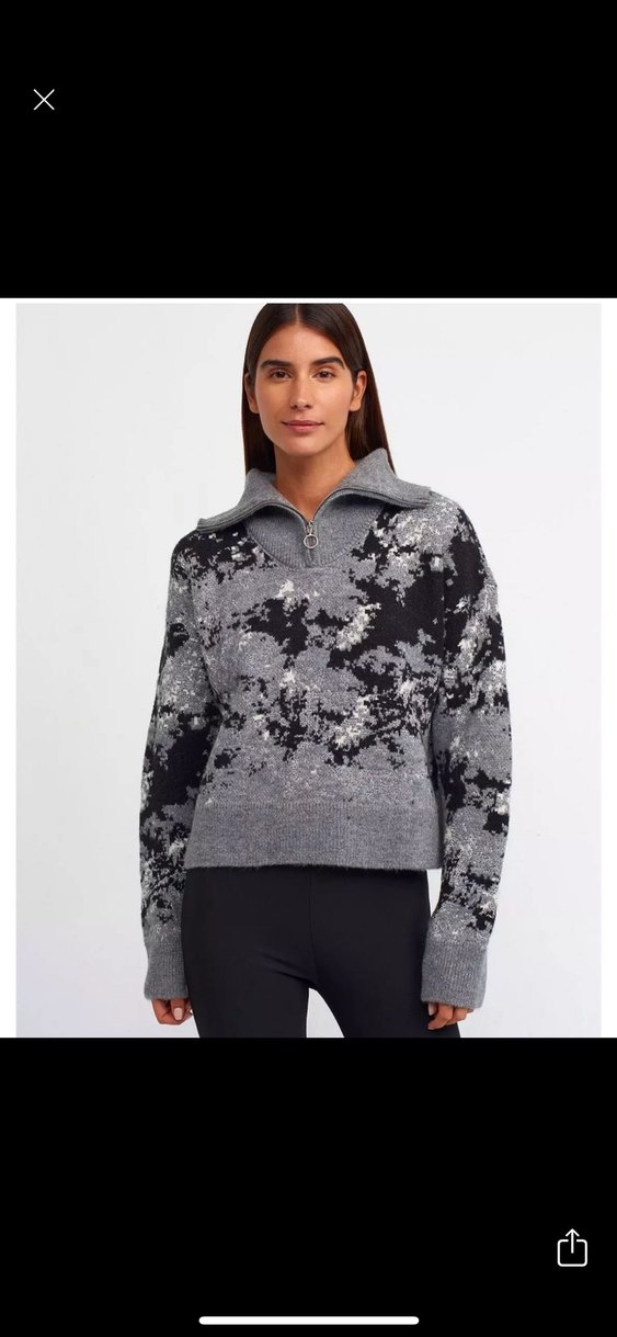 Gri batik desenli, yarım fermuarlı, yüksek yakalı ve bol kesim kadın sweatshirt. Yumuşak ve sıcak kumaştan, uzun kollu ve normal boyda, günlük kullanım için uygundur.