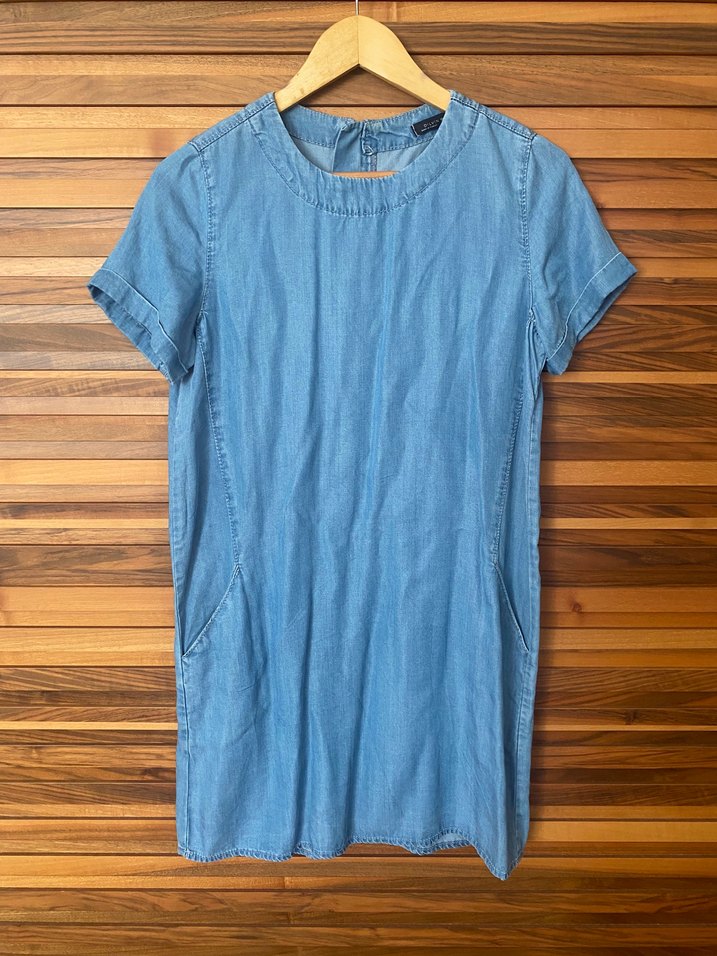 DİLVİN marka. Kısa kollu, bisiklet yaka ve bol kesim denim elbise. Desensiz, günlük kullanıma uygun rahat bir model.