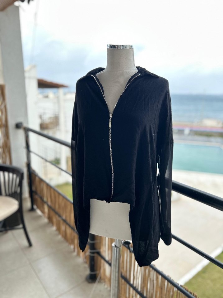 yüksek yakalı ve fermuarlı uzun kollu, bol kesim midi boy gömlek. Rahat ve günlük sokak stili için uygun.