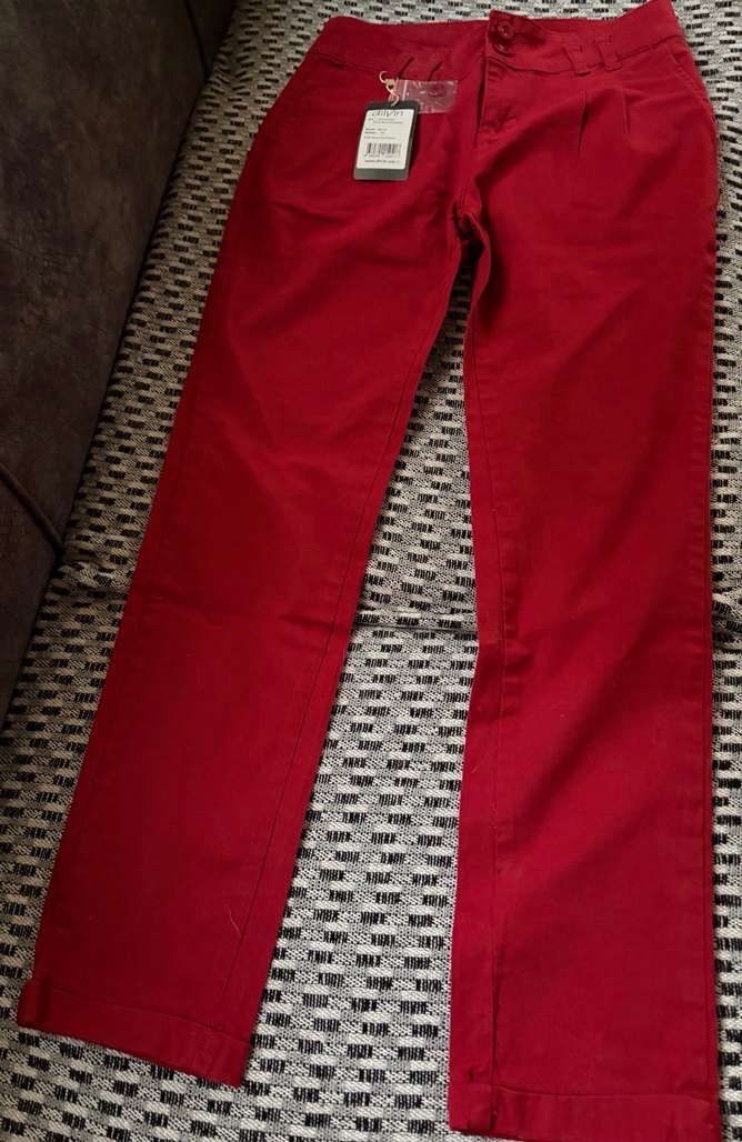 Kadınlar için kırmızı pantolon etiketli ve yedek düğmesi mevcuttur 36 bedendir