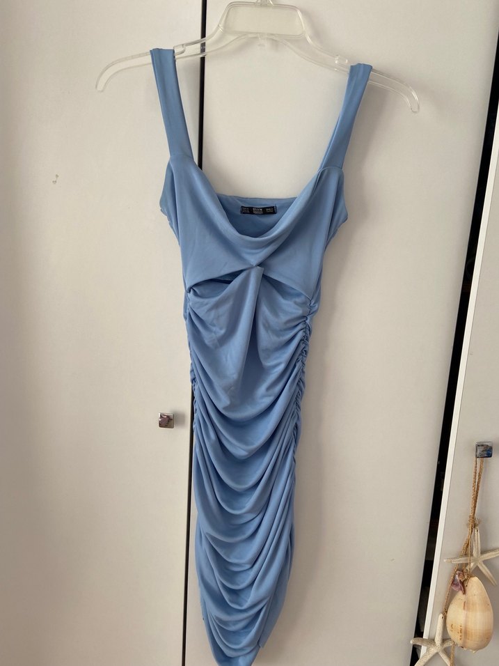 Bu mavi drapeli midi elbise, V yakalı ve kolsuz olup, vücuda oturan kesimi ile romantik akşamlar ve tatiller için uygundur.
