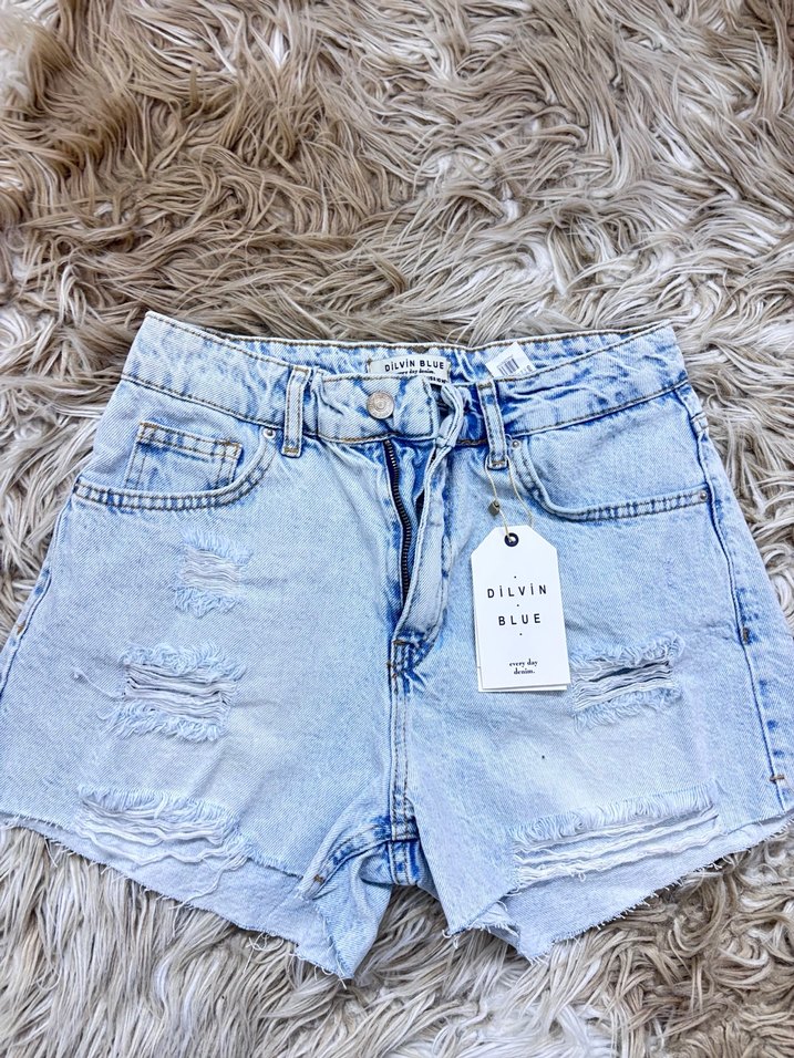 Yırtık detaylı, bol kesim mavi denim mini şort. Günlük kullanım için uygun, rahat sokak stili. Marka: DILVIN.