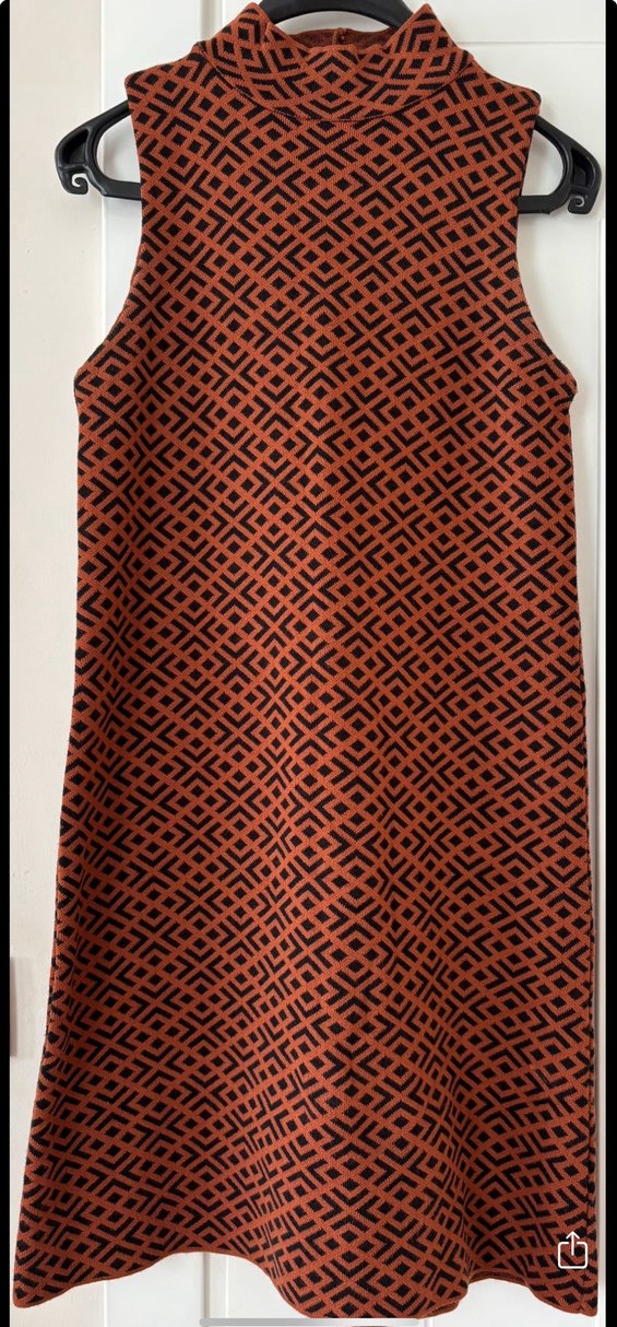 Kahverengi, desenli, yüksek yakalı, kolsuz örgü elbise. #giyim #kadın #elbise