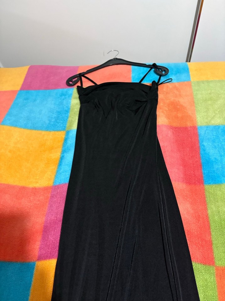 Dilvin marka Siyah, drapeli ve askılı uzun elbise, straplez yakaya sahip, sentetik kumaştan üretilmiş ve hafif batik desenlidir. Avant-garde parti tarzına uygundur. Askıları Arkadan çapraz