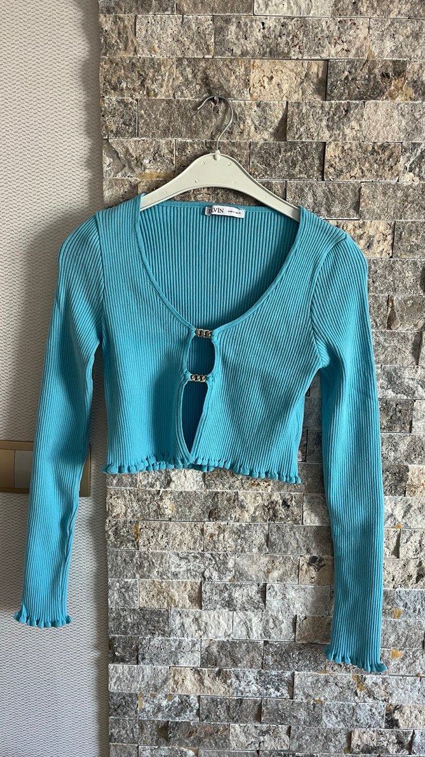 Turkuaz renkli, uzun kollu, kısa kesim ve metal halka detaylı ön kesim tasarımına sahip triko kadın kazak. Günlük sokak stili için uygundur.