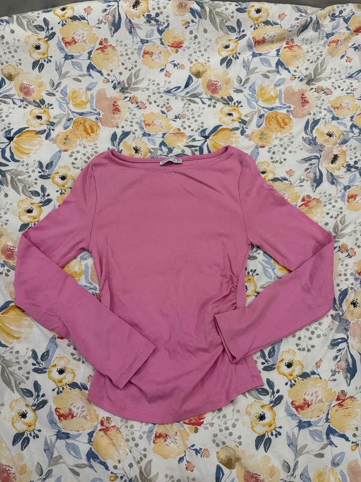 Dar kesim, uzun kollu, bisiklet yaka ve pastel pembe renkte bluz. Yumuşak sentetik kumaştan, küçük fırfır detaylı, sokak modasına uygun. Sadece 1 kere giyildi hiçbir sorunu yoktur.