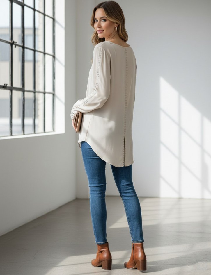 Dilvin XL beden taş rengi bluz,modeli baskı detayları ile çok şık bir gömlek,arkası önüne göre daha uzun bir modeli var,kullanılmadı, sorunsuzdur.