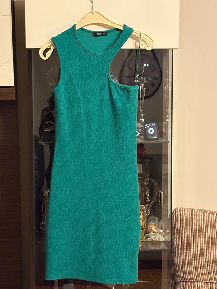 Dilvin marka fitilli yeşil elbise. Vücut hatlarını çok güzel gösteriyor ve asimetrik yakası çok havalı duruyor. Bedenime olmadığı için satıyorum