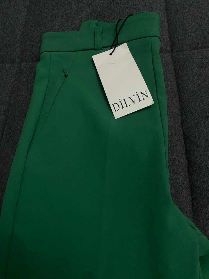 DiLVIN marka, yeşil renkte, regular fit kesimli, fermuarlı ve midi boyda sentetik kumaştan yapılmış kadın kumaş pantolon.