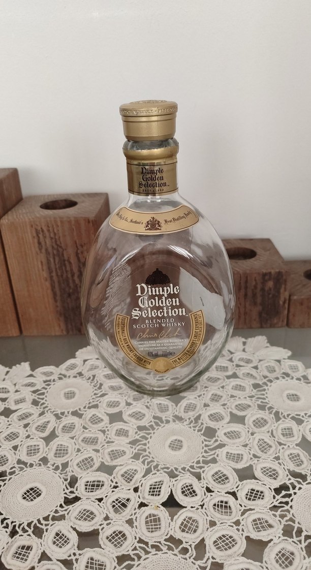 Altın kapaklı şeffaf cam şişede Dimple Golden Selection kadın kolonyası. Dengeli ve zarif bir koku sunar.