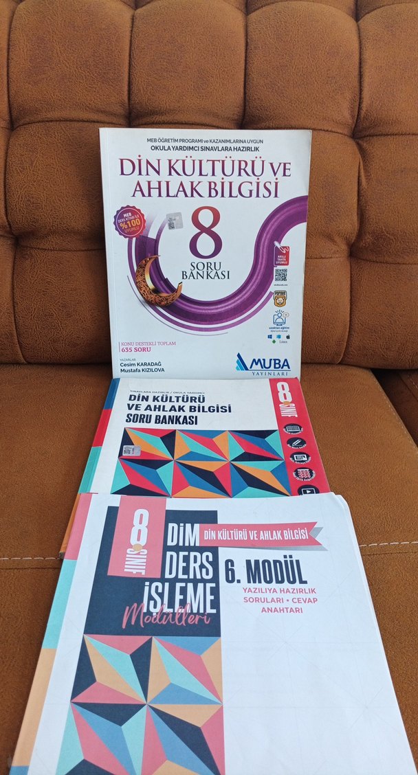 Muba Yayınları'ndan Din Kültürü ve Ahlak Bilgisi 8. sınıf soru bankası ve 6. modül ders işleme kitapçığı, cevap anahtarı ile birlikte.soru bankası kullanılmadı 2 modül temiz hediye .beş yayınlarında çoğu çözülmüş oda hediye