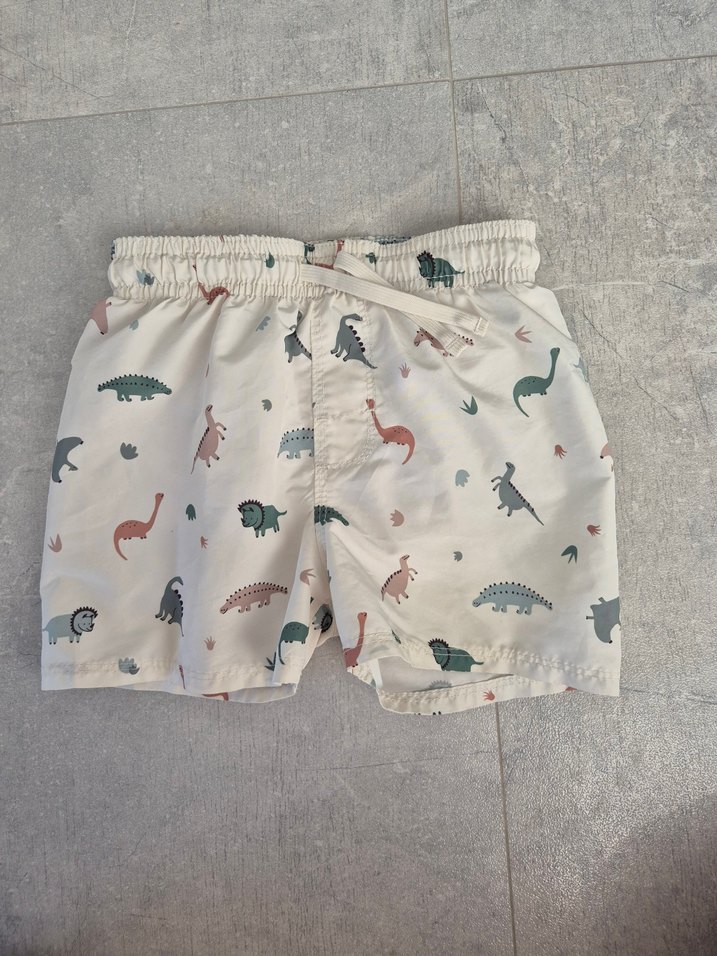 Rahat kesim, beyaz erkek çocuk şortu. Renkli dinozor desenleri ve yumuşak sentetik kumaştan.