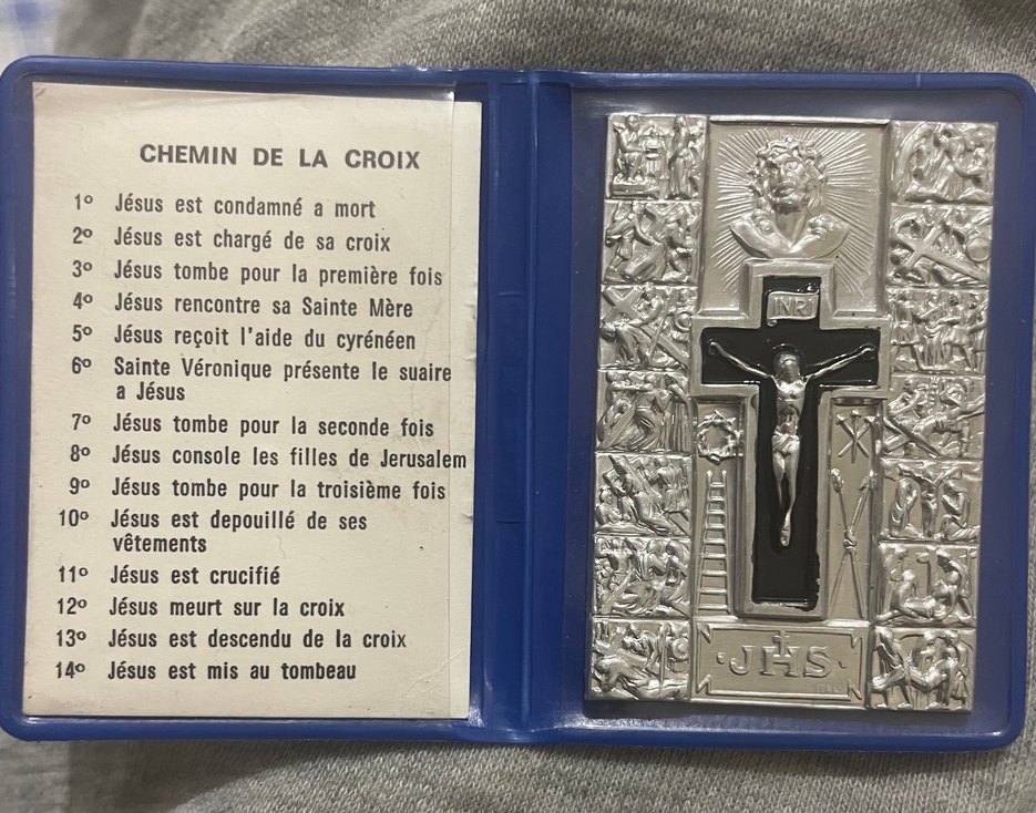 Koleksiyonluk Dini antika Fransız Katolik gümüş kaplama madalyon kolye, anıt plaket, Kutsal İsa ve Çarmıha Geriliş Sahneleri tasviri.