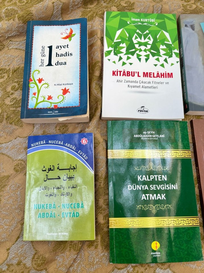 Günlük dua, hadis, ayet ve manevi konuları içeren kitap seti, dünya sevgisi ve kıyamet alametleri gibi temalar içerir. tane 150