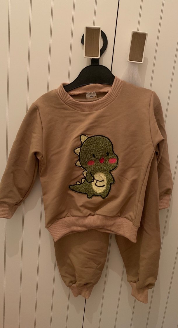 Uzun kollu, yuvarlak yaka, yumuşak ve sıcak kumaştan yapılmış bebek takımı. Pastel kahverengi tonlarında örme dinozor baskılıdır.