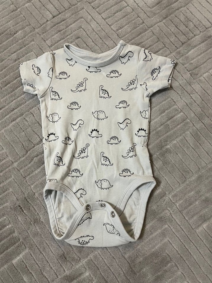 Bebek 2/4 ay çıtçıtlı zıbın az kullanılmıştır temizdir… Dinozor desenli, kısa kollu ve düğmeli pamuk bebek body. Gri renkte, rahat ve kullanışlıdır.