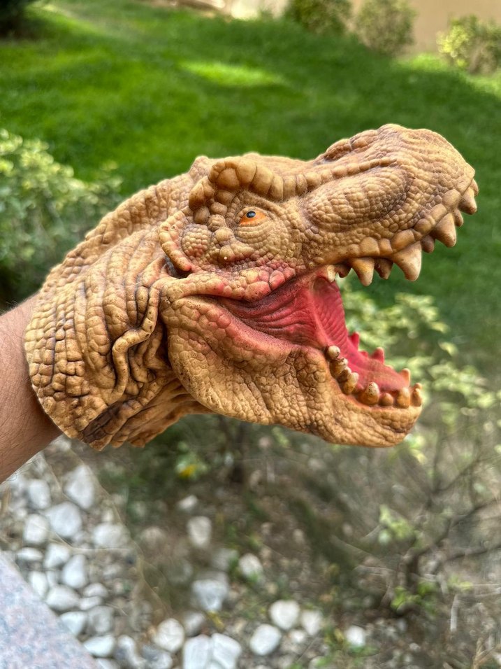 Detaylı dokulara ve canlı renklere sahip kahverengi dinozor kuklası, açık ağız ve görünür dişlerle gerçekçi bir görünüm sunar.
