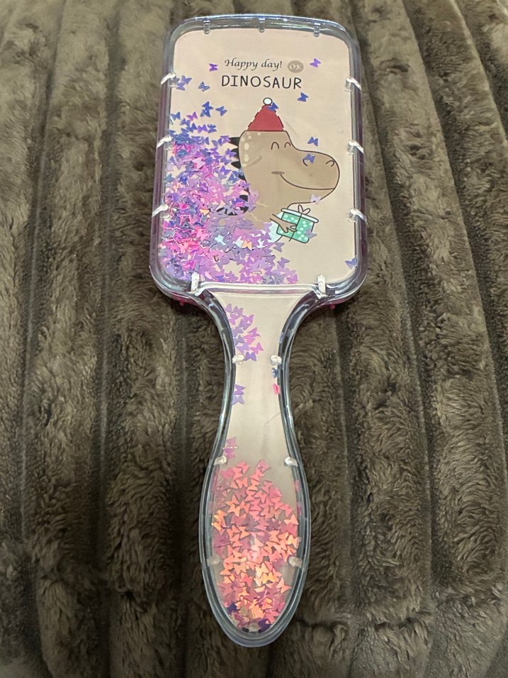Pembe yıldız simli, şeffaf saplı saç fırçası. Üzerinde 'Happy day! DINOSAUR' yazılı sevimli dinozor figürü bulunur. Saç bakımına eğlence katar.