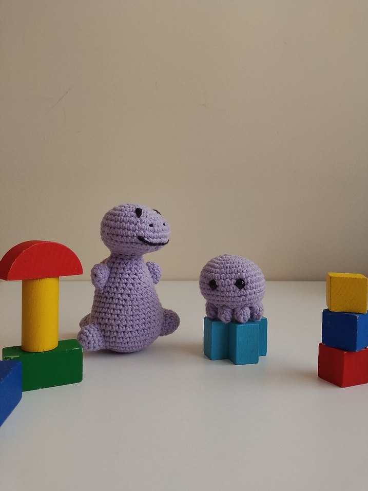 Renkli mor el örgüsü peluş oyuncaklar, dinozor ve ahtapot figürleriyle oyun, dekorasyon, anahtarlık için uygundur.