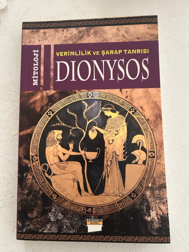 Mitoloji kitabı Dionysos'u, verimlilik ve şarap tanrısını anlatıyor. Kapakta antik Yunan sanat eseri bulunuyor.
