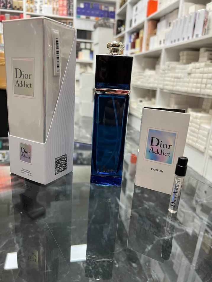Dior Addict kadın parfümü, şık mavi şişede ve gümüş kapaklıdır. Set, orijinal kutuludur