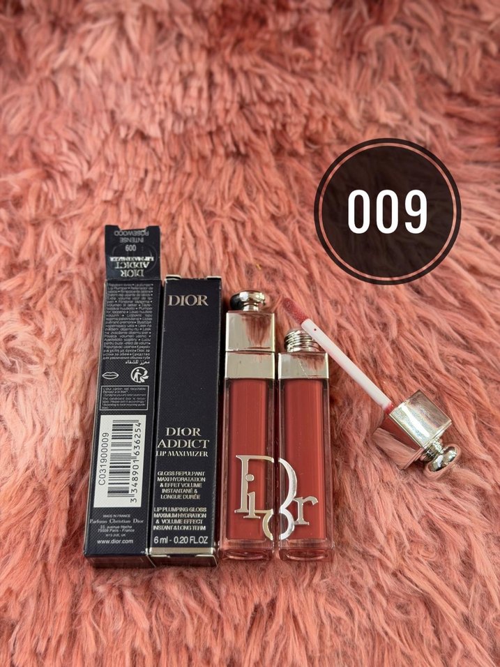 Dior Addict Lip Maximizer 009 numaralı koyu bej renk, parlak bitişli rujdur. Şeffaf tüp ve gümüş kapaklı, aplikatörlü ambalajda sunulur. Ürün sıfır ve etiketlidir.