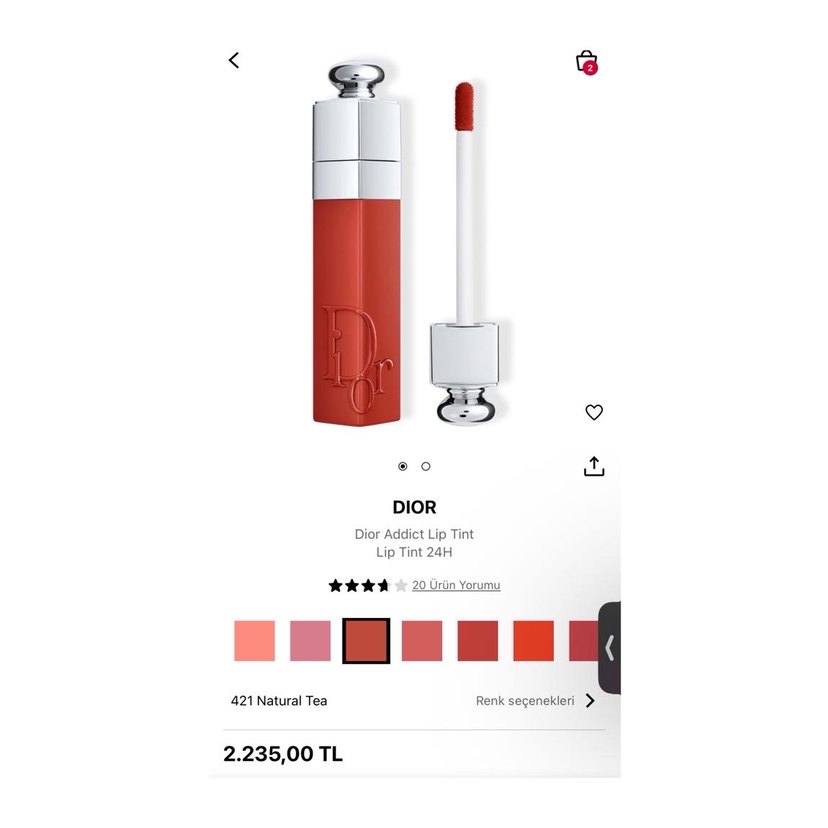 Dior Addict Lip Tint, 24 saat kalıcı, 421 Natural Tea numaralı açık kırmızı renkte canlı renk sunar. Pürüzsüz uygulama sağlar.