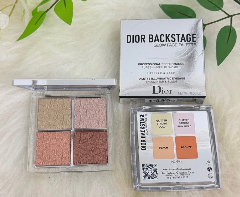 Dior Backstage Glow Yüz Paleti, altın ve pembe ışıltılı, şeftali ve bronz tonlarıyla aydınlatıcı ve allık içerir.
