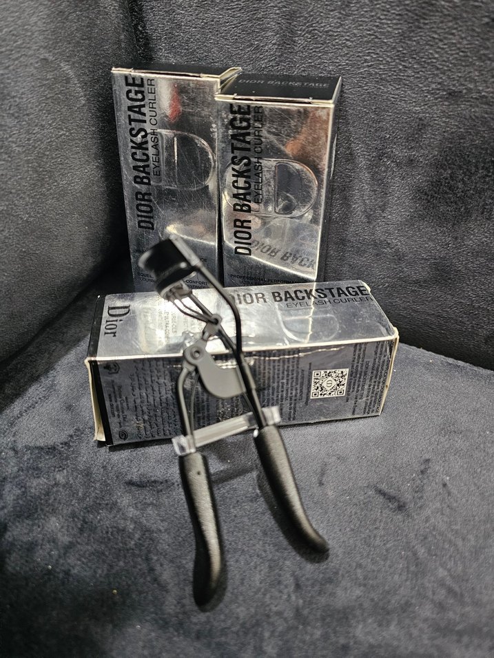 Dior Backstage siyah kirpik kıvırıcı, ergonomik saplar ve sağlam yapıya sahiptir. Ambalajında Dior logosu ve ürün bilgileri yer alır.