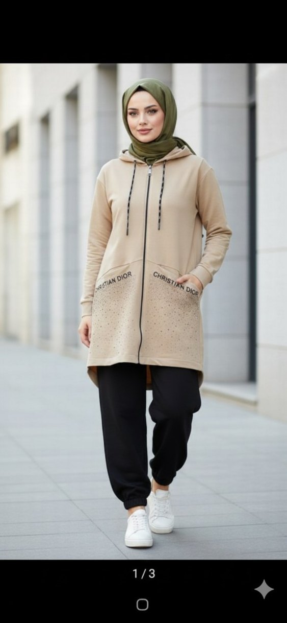 Kapüşonlu ve fermuarlı, bol kesim uzun bej ceket. Esnek rahat kumas, ceplerinde 'Christian Dior' yazısı ve sokak tarzı görünümüyle günlük kullanıma uygun. Taşlı tasarımıyla günlük kombinlerinize sade şıklık katar.