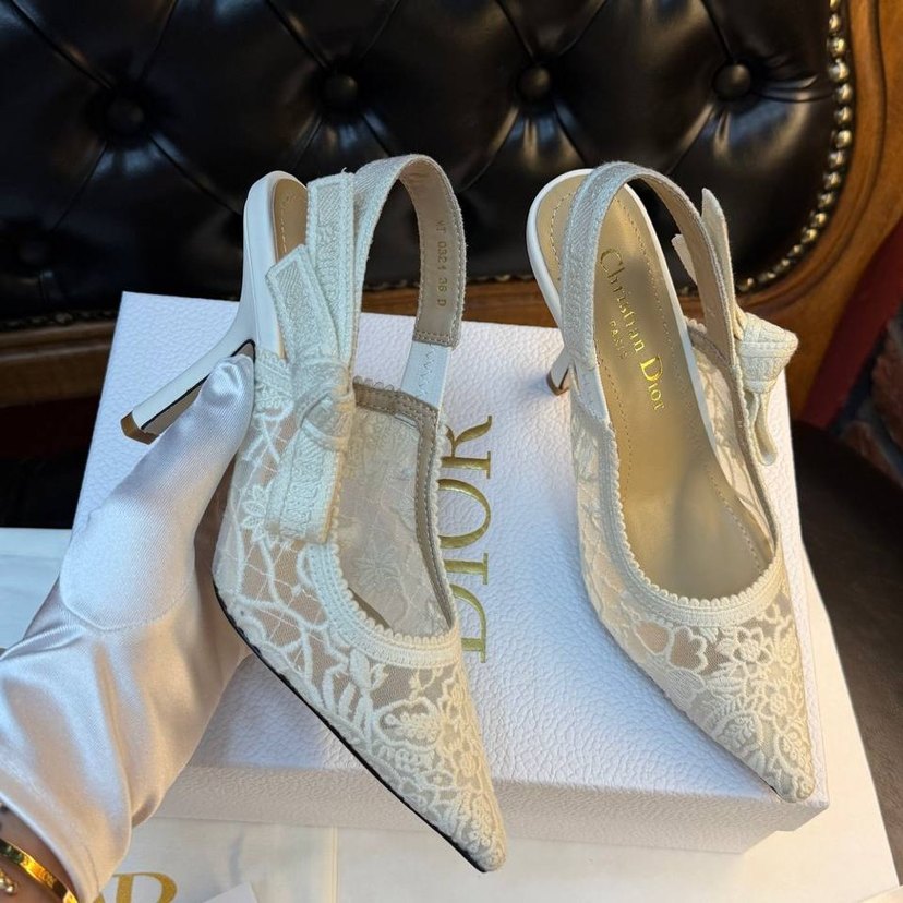 Dior markalı beyaz dantel işlemeli stiletto topuklu ayakkabı, modern klasik tasarıma sahip. Düğün gibi zarif etkinlikler için uygundur.