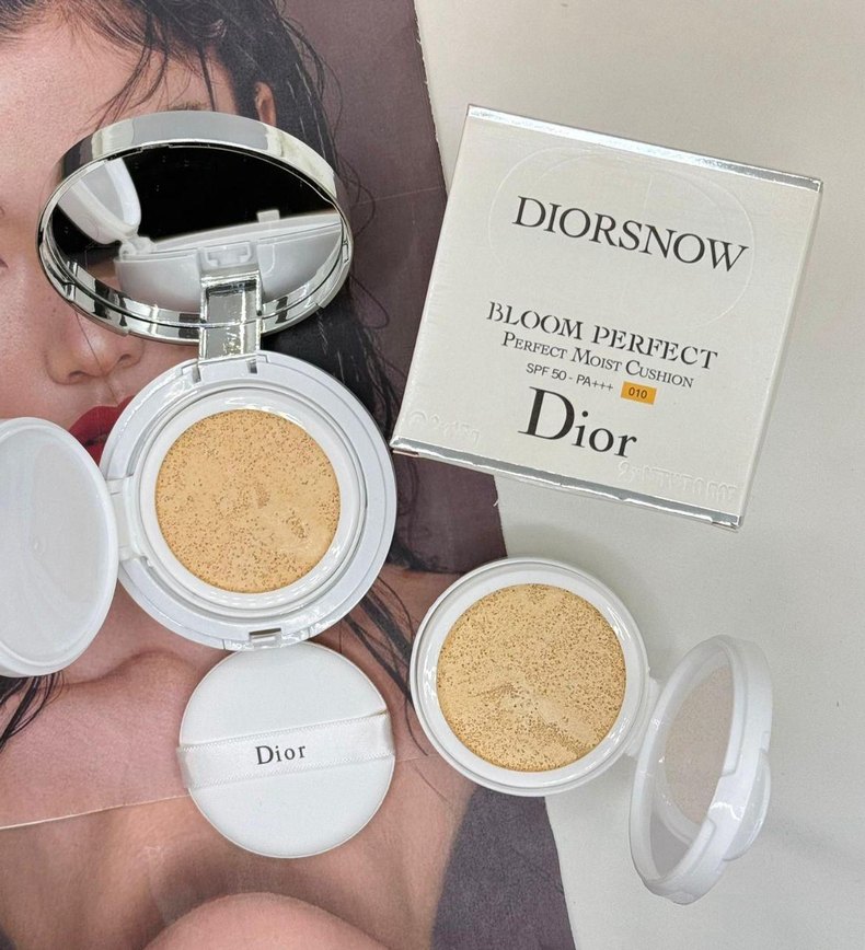 Dior Bloom Perfect fondöten, SPF 50 korumalı ve doğal bitişli açık bej tonunda. Kompakta ayna ve aplikatör bulunur.