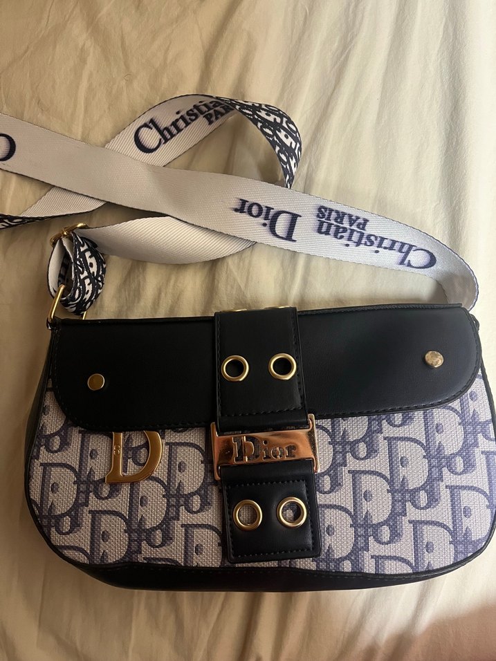 Dior marka, baskılı deri, koyu mavi tonlarında ve tokalı kapaklı kadın çantası. Christian Dior Paris yazılı geniş askısı ile rahat sokak stiline uygun.