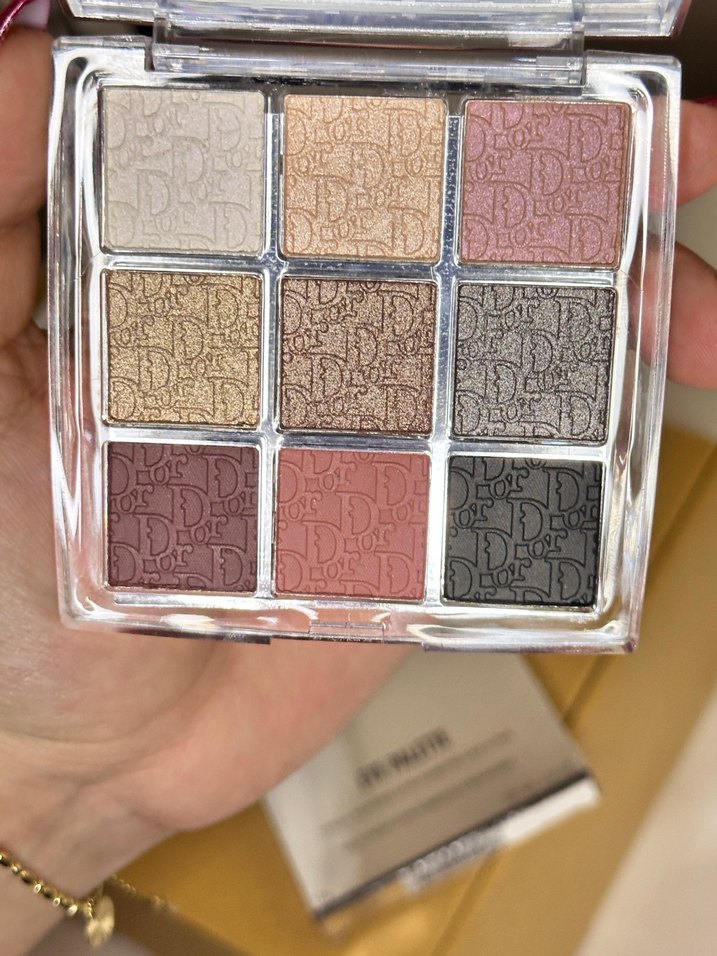 Dior göz farı paleti, bejden koyu tonlara kadar dokuz renk içerir. Her renkte kabartmalı marka detayı bulunur. Canlı renk seçenekleri sunar.
