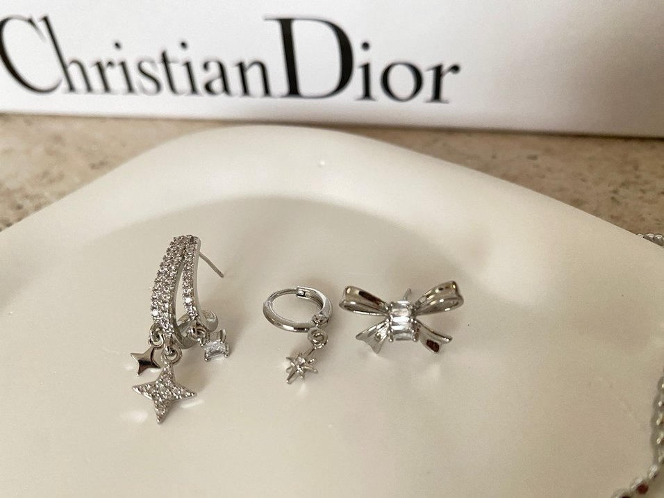 Dior imzalı, fiyonk ve yıldız işlemeli gri mini küpeler. Düğün ve sokak stili için uygun, sade ve Paris esintili tasarım