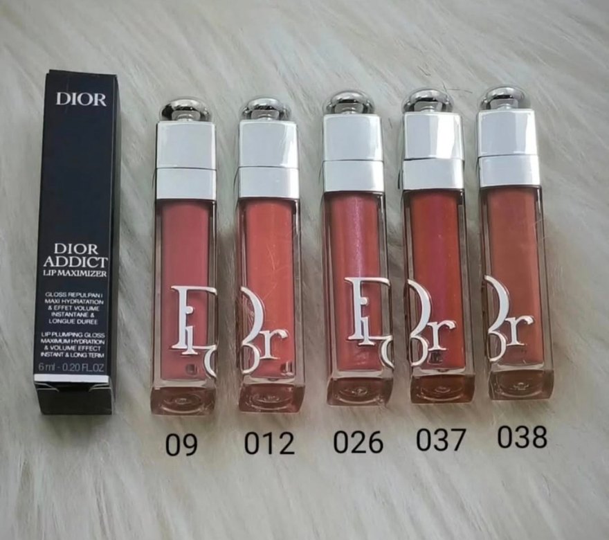 Dior Parlak bitişli, 09, 012, 026 ve 037 numaralı hafif kırmızı tonlarda dudak parlatıcıları. Canlı ve hafif renk etkisi sunar.