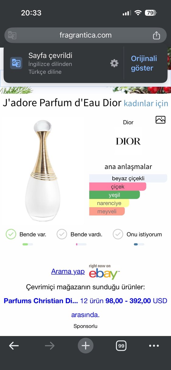Dior J'adore Parfum d'Eau, beyaz çiçekli, çiçeksi, yeşil, narenciye ve meyveli notalara sahip kadın parfümüdür. 15 ml bir iki fıs sıktım