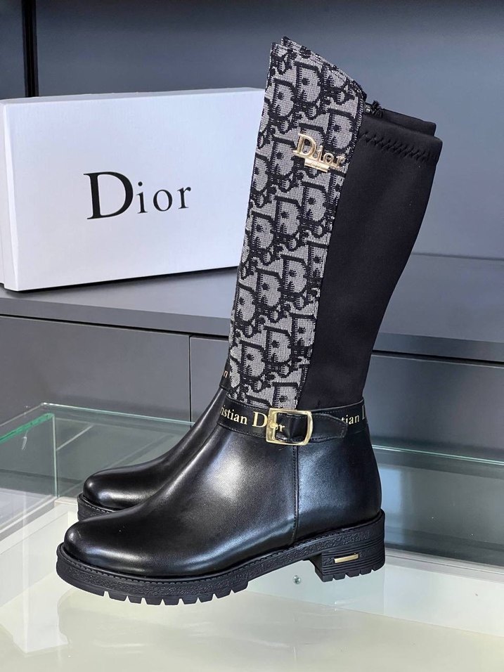 Dior siyah deri ve kumaştan, tokalı kayış ve kalın topuklu dizüstü çizme. Hafif yılan deseni ve logo detayı bulunur.