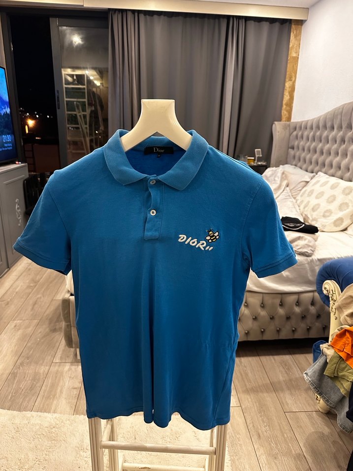 Düğmeli, yakalı ve kısa kollu, vücuda oturan erkek polo tişört. Denim kumaştan, parlak mavi renkte, DIOR baskılı. Günlük kullanıma uygun.