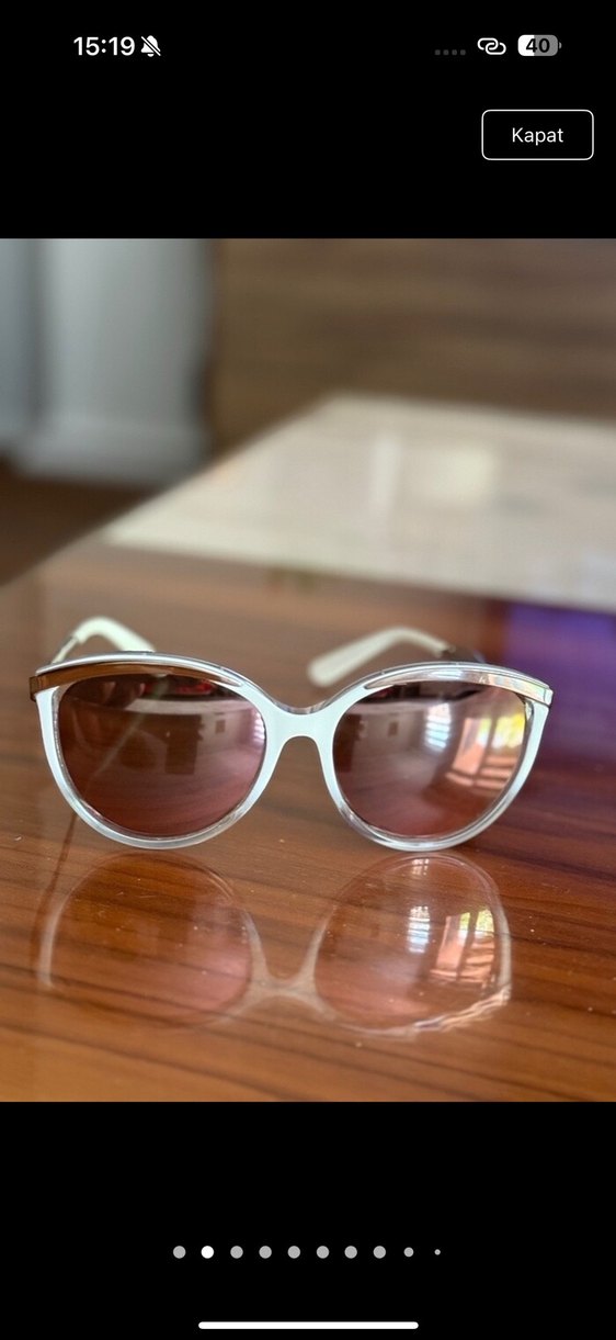 Çok az kullanıldı camında hiç bir cizik yoktur.son resimde görüldüğü üzere kulpundaki taşı düştü.fakat takınca gözükmüyor.orjinaldir şeffaf beyaz çerçeveli, kahverengi tonlu mercekli, bohem ve Paris esintili çağdaş kadın güneş gözlüğü.
