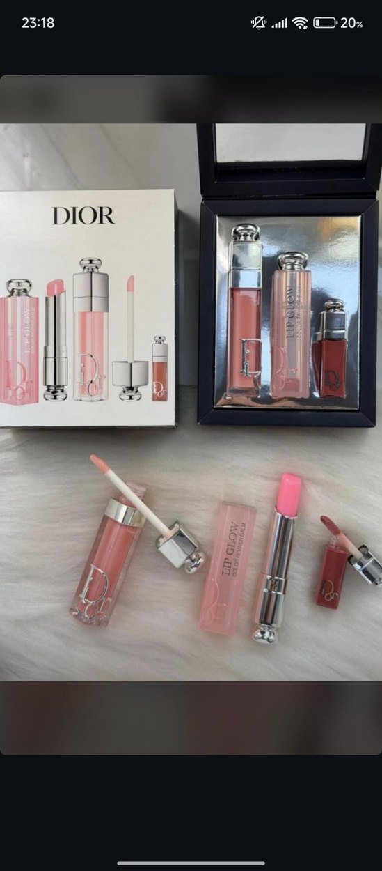 Dior dudak bakım seti, açık pembe renkte parlak ve yumuşak dokulu ruj ve parlaklıklardan oluşur. Dudaklara hafif renk katar.