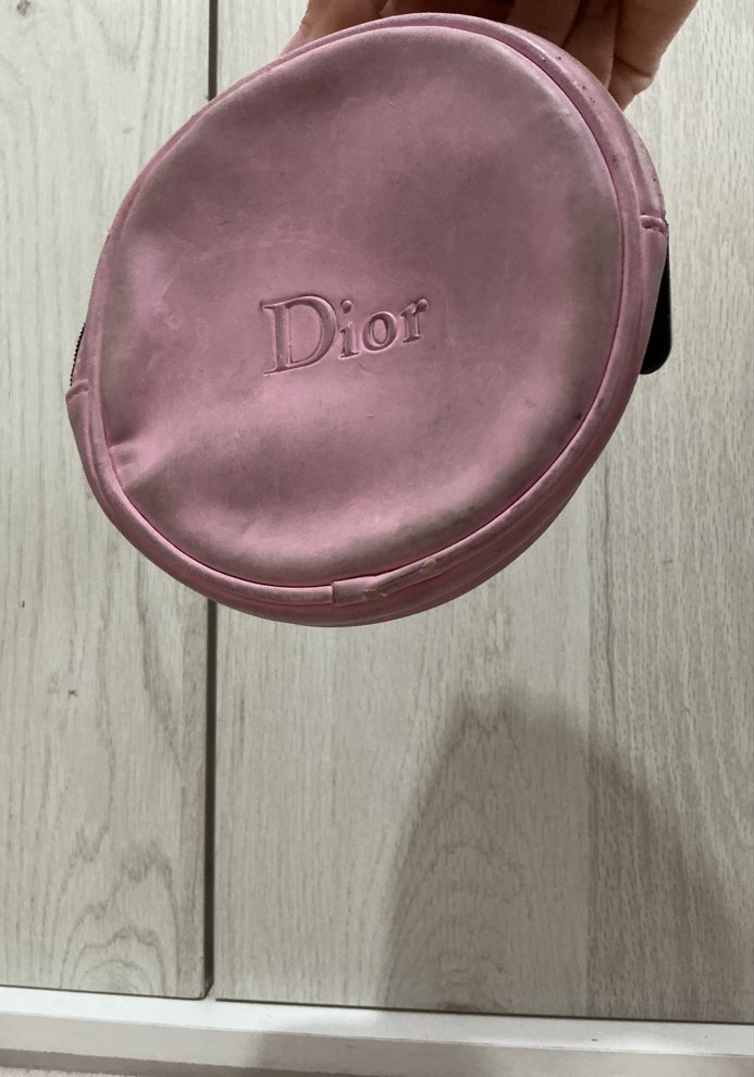 Dior logosu kabartmalı, yumuşak dokulu pastel pembe yuvarlak allık çantası. rengi biraz gitmis ama baska sıkıntısı yok