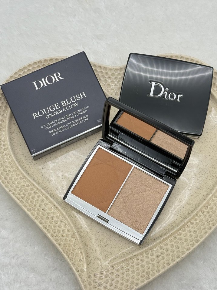 Dior Rouge Blush, koyu bej tonlarında çift renk allık ve aydınlatıcı içerir. Şık siyah kutusunda aynası bulunur.
