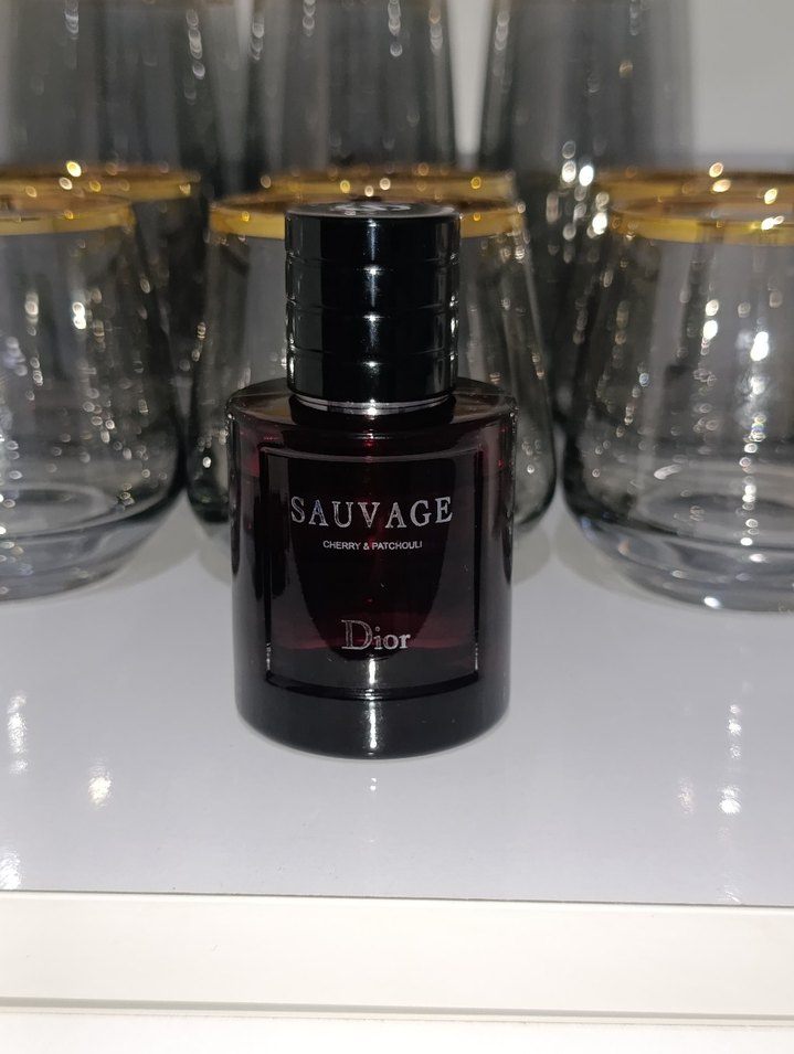 Koyu bordo şişede Dior Sauvage erkek parfümü, kiraz ve paçuli notalarıyla güçlü bir koku sunar. Paris tarzı karşı kültür esintili. çok az kullanıldı