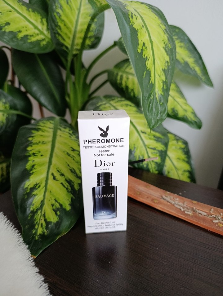 Dior Sauvage tester şişesi, koyu gri tonlarda, Parisli karşı kültür tarzında. Feromon etkili Eau de Parfum.