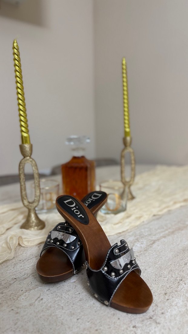 Dior Siyah Deri Yılan Desenli Tokalı Topuklu Terlik