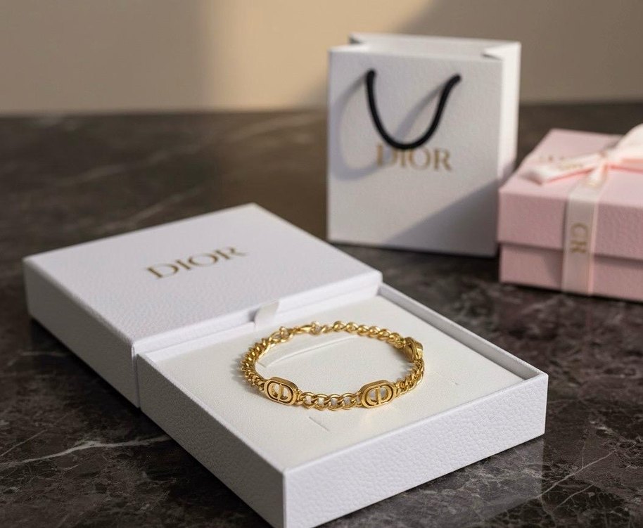 Dior markalı, parlak altın renkli, zincir detaylı bileklik, modern ve klasik şıklığı romantik akşamlar için tamamlar. ✨