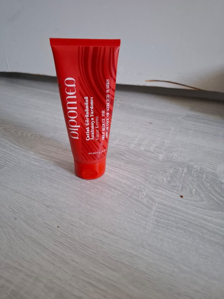 Dipomeo kırmızı tüpte 100 ml çatlak onarıcı krem, doğum çatlağı,kilo alıp vermede oluşan çatlakları onarıcı krem bir miktar kullanılmıştır.