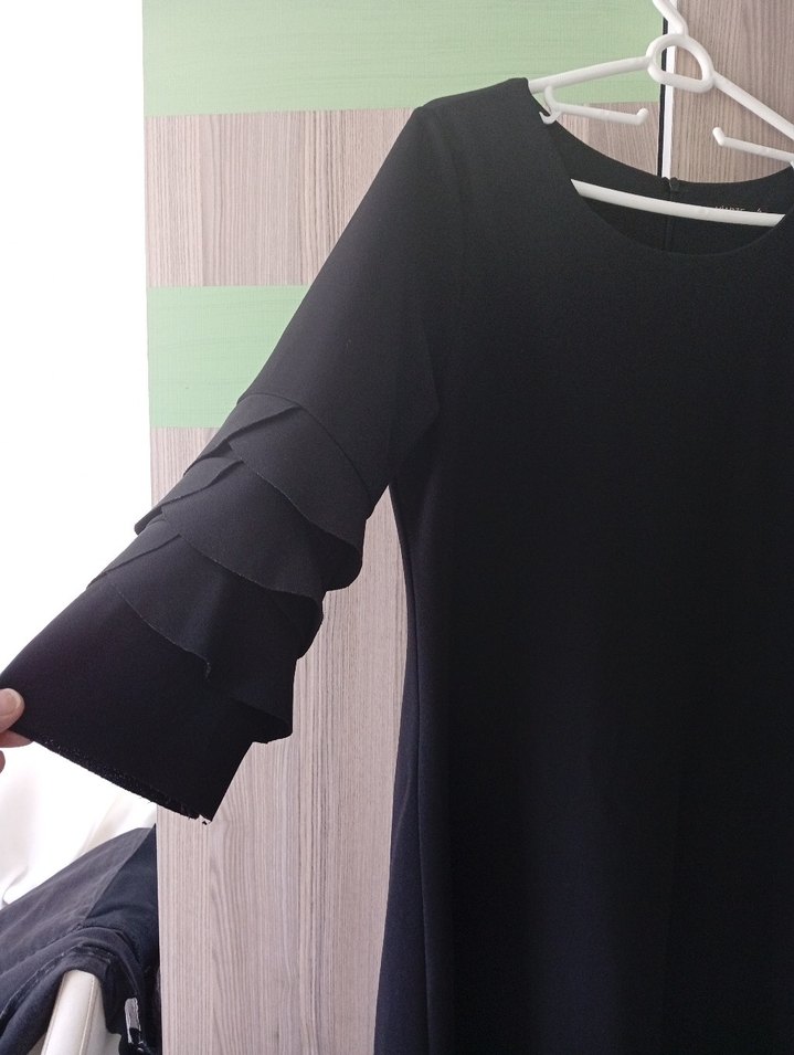 Siyah elbise, yuvarlak yaka ve kat kat fırfırlı kollara sahiptir. Regular fit kesim, yumuşak kumaştan üretilmiştir. sıfır sayılır.