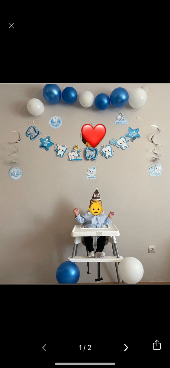 Bir kere kullanıldı. Fotoğrafta balonlar hariç gönderilecektir. Ekstra yandaki sarkıtlardan açılmamış ve açılmamış klips, kürdanlık kullanılmadı, ilk dişim şapkası Tertemiz poşetli gönderilecek